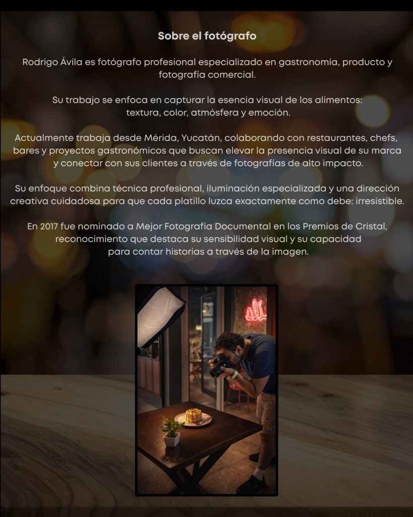 Nuestro servicio de Fotografía Gastronómica está diseñado para resaltar la esencia, calidad y detalle de cada platillo, creando imágenes que abren el apetito, venden y conectan con tus clientes